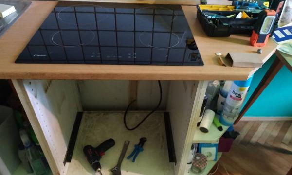 Pri gospodu Bojanu smo menjali staro pečico v kombinaciji s plinsko kuhalno ploščo Gorenje za nov kuhinjski set Candy. Gospod ni želel imeti več kuhališča na plin in pri pečici je zaradi okvare tečaja na vratih počilo steklo. Gospod Bojan se je odločil za nakup novega kuhinjskega set s steklokeramično ploščo. Tudi tokrat ni šlo brez rezanja in prilagajanja.