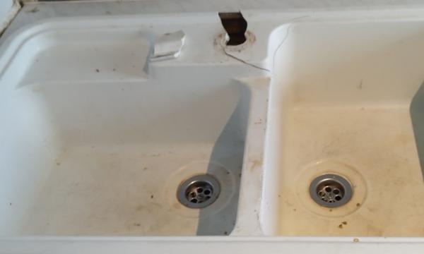 Gospe Mojci je počilo staro kuhinjsko korito. Poklicala nas je, da ji čim hitreje zamenjamo korito, ker je staro neuporabno in nefunkcionalno, poleg tega sta ji zamakala še ventila za toplo in hladno vodo. Prišli smo naslednji dan in ji zamenjali staro korito za novo dvojno korito vključno z montažo nove pipe in sifona. Zamenjali smo ji tudi stara ventila z novimi.