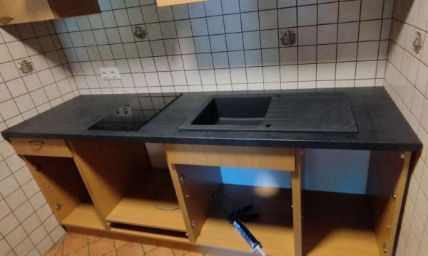 • Opis reference Stranki smo zamenjalu pult, naredili izreze za kuhalno ploščo in kuhinjsko korito. Vgradili smo kuhinjsko korito vključno s kuhinjsko armaturo in sifonom. Vgradili in priklopili smo tudi kuhalno ploščo in pečico.