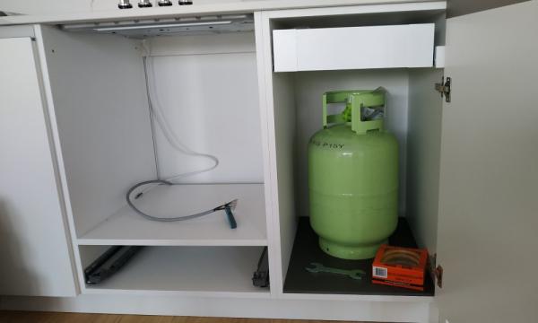 • Opis reference Gospod Matej nas je poklical zaradi priklopa kombinirane kuhalne plošče Bosch na plinsko jeklenko. Ker gre za novogradnjo in kuhinjo narejeno po meri, smo prvo preverili možnost priklopa na električno omrežje. Ploščo smo brez težav priklopili na že puščen trofazni električni vodnik. Sledil je še priklop plina iz jeklenke na kuhalno ploščo. Na plinsko cev smo namestili regulator plina, ki skrbi za konstanten pritisk plina in priključek, kateri se namesti na samo kuhalno ploščo. Cev smo privijačili na jeklenko in kuhalno ploščo. Preverili smo tesnenje cevi oz.priključkov in vse skupaj tudi preizkusili ter zaključili z montažo. Čas montaže ca. 1.5 ure.
