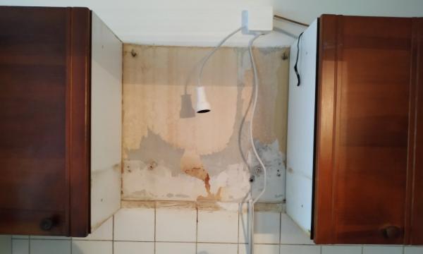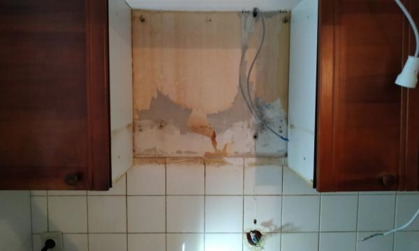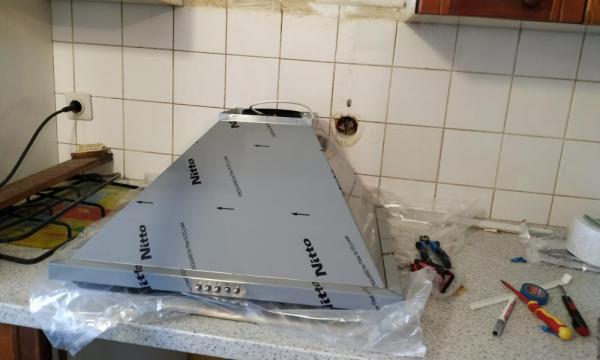 Napo smo montirali na mesto, kjer je bil kuhinjski element. Siituacija je bila malo bolj zapletena, saj smo morali iz spodnje vtičnice potegniti električni vodnik do vrha kuhinjskih elementov, kamor smo kasneje priklopili napo in podelementno luč. Poiskali smo električni kanal in s posebnim inštrumentom locirali približno točko, kjer smo s prebojem betonske stene prišli do električnega kanala in skozi potegnili električni vodnik. Glede na to, da je stena iz armiranega betona, je bilo potrebnih kar nekaj poizkusov, da smo zavrtali natančno v električni kanal, prav tako pa je bilo potrebno paziti, da ne poškodujemo že obstoječih električnih vodnikov, ki so že v samem kanalu. Potegnili smo vodnik iz vtičnice do narejene odprtine in tako rešili obstoječi problem. Določili smo višino nape in jo pritrdili, prav tako smo pritrdili tudi prvi del dimnika v katerega smo naredili majhno odprtino za kabel nape, ki je sedaj priklopljen v vtičnico na vrhu kuhinskega elementa. Na samem koncu smo pritrdili še cev za odvod zraka, ki je speljana po elementih, do odvodnega jaška. Gospot Borut se je odločil, da bo za sanacijo lukenj, ki so ostale še od preteklih montaž in beljenje poskrbel sam. Poskrbeli smo še za eno uspešno montažo. Čas montaže 3,5 ure.