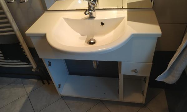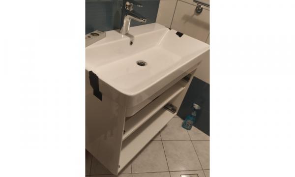 - Opis reference Gospe Izi smo zamenjali star kopalniški blok z novo kopalniško omarico in toaletno omarico z ogledalom in lučjo. Odstranili smo star blok in namestili spodnji del viseče omarice. Na omarico smo namestili umivalnik na katerega smo pred tem namestili kopalniško armaturo. Pipo smo priklopili na vodovod in namestili nov sifon. Nad umivalnik smo pritrdili še omarico z ogledalom na katero smo prav tako predhodno namestili led sijalko. Led sijalko in vtičnico, ki je v omarici smo priklopili še na električno omrežje. Na samem koncu pa smo še zasilikonirali stik umivalnka s steno. S tem smo preprečili zacejanje vode po steni za omarico. Preizkusili smo vsa tesnenja in zaključili z montažo. Čas montaže 4 ure.