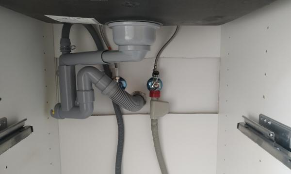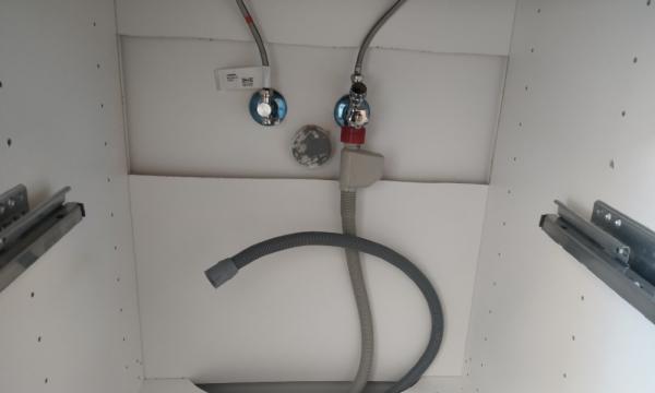 Ker še ni bilo sifona, smo zaradi lažjega dostopa najprej priklopili kuhinjsko pipo, nato pa še pomivalni stroj. Sifon je bilo potrebno prilagoditi tako, da ni oviral predalov, ki so nameščeni pod kuhinjskim koritom. Ko je bil sifon nameščen, smo preverili vsa tesnenja, prav tako armaturo, ter naredili prvi zagon pomivalnega stroja.