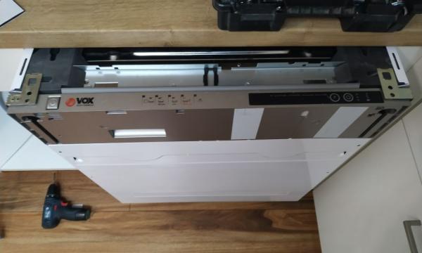 - Opis reference Tokrat stranka v kuhinji še ni imela pomivalnega stroja. Gospa Nataša nam je predhodno poslala slike, da smo ocenili ali ima vso potrebno predinštalacijo. In ker so že pri sami zasnovi kuhinje predvidevali, da bodo imeli pomivalni stroj, je bila inštalacija že prepripravljena. Odstranili smo kuhinjski element in namesto njega namestili vgradni pomivalni stroj Vox. Stroj smo dvignili na željeno višino, potegnili vso napeljavo do elementa z vodovodno in električno inštalacijo, ter vse skupaj priklopili. Nato smo se posvetili montaži kuhinjske fronte na stroj. Ker je bila fronta oz. kar vrata del kuhinjskega elementa, smo odstranili tečaje vrat in poglobili vijake ročaja. Za vijake je priporočljivo, da so poglobljeni zaradi samega stika med fronto in strojem. V nasprotnem je zaradi njih lahko fronta nekoliko ukrivljena ali pa vijaki drsajo po stroju. Predvsem je to potrebno izvesti na strojih z drsnim odpiranjem vrat. Fronto smo namestili na pomivalni stroj, ter vse skupaj naravnali in stroj fiksirali z vijaki. Pomivalni stroj smo še preizkusili, preverili ali ni puščanja vode in zaključili z montažo. Čas montaže ca 1.5 ure,